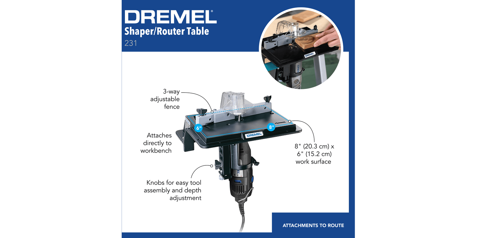 Convert your corded rotary tool into a light-duty, bench-mounted precision wood shaper with the Dremel 231 shaper/router tableEasily mounts to any tabletop workspace and is compact and easy-to-store when not in useFeatures simple-to-grip plastic knobs that include a screwdriver slot for easier rotary tool assembly and a depth adjustment screw enabling you to adjust to the desired depth of cutThe 3-way adjustable fence allows for accurate detail and finish while the compact & smooth 8 In. x 6 In. worktable is ideal for light-duty detail projectsCompatible with Dremel rotary tool models 4300 (use with collet & collet nut), 4300, 4000, 3000, 200 series, 100 series, 8220