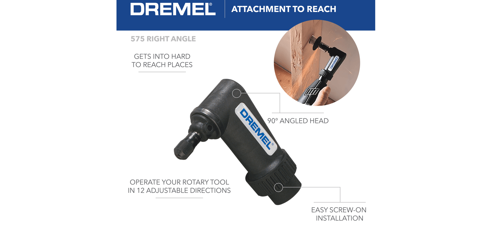 Enhances the versatility of your Dremel rotary tool by allowing you to get into hard-to-reach areasGet the right angle to tackle the hard-to-reach places, the 575 right angle attachment adjusts in 12 easy-to-change directionsThe fixed 90°, angled head of the attachment keeps the tool sturdy as well as provides visibility to your workpiece or surfaceBall bearing and spiral bevel gears give long lasting durability along with smooth and cool operationAttaches to your Dremel rotary tool in a few simple steps to allow you to jump into your projects quicklyThe compact and durable design adds minimal weight to your Dremel rotary tool ensuring a similar feel when usingCompatible with Dremel rotary tool models 4300, 4000, 3000, 200 Series, 100 Series and 8220