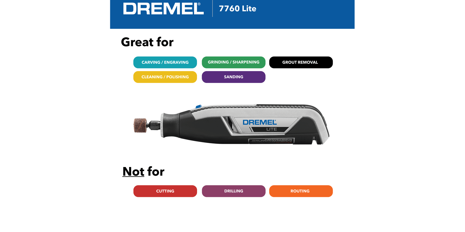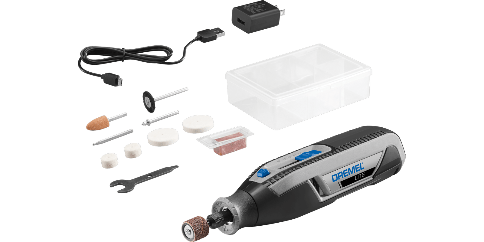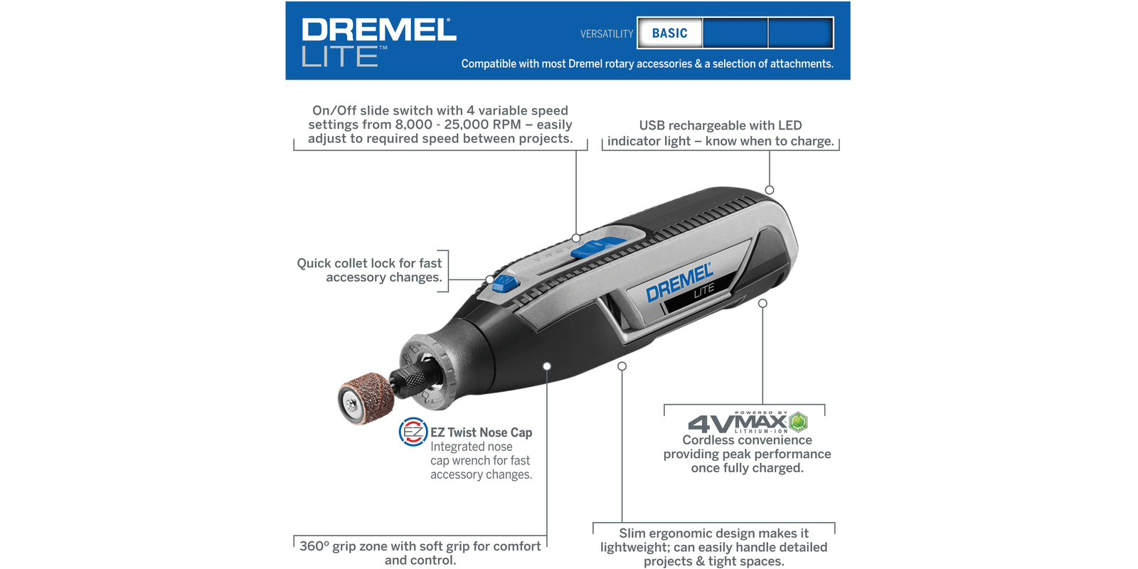 Quick and easy accessory changes – with the patented EZ twist nose cap accessory changes are easy and can be done without the need of a wrenchVariable speed – seamlessly adjust to the ideal speed from 8,000 to 25,000 for optimal control and maneuverabilityEasy battery charging – the rechargeable 4 V Li-Ion battery and convenient USB charger ensures that it’s ready whenever you areBattery life indicator – LED light illuminates to notify you when the battery needs to be chargedPortable and lightweight – 360 degree soft grip material allows for comfort and precise controlCompatible – can be used with most Dremel accessories and a selection of attachments