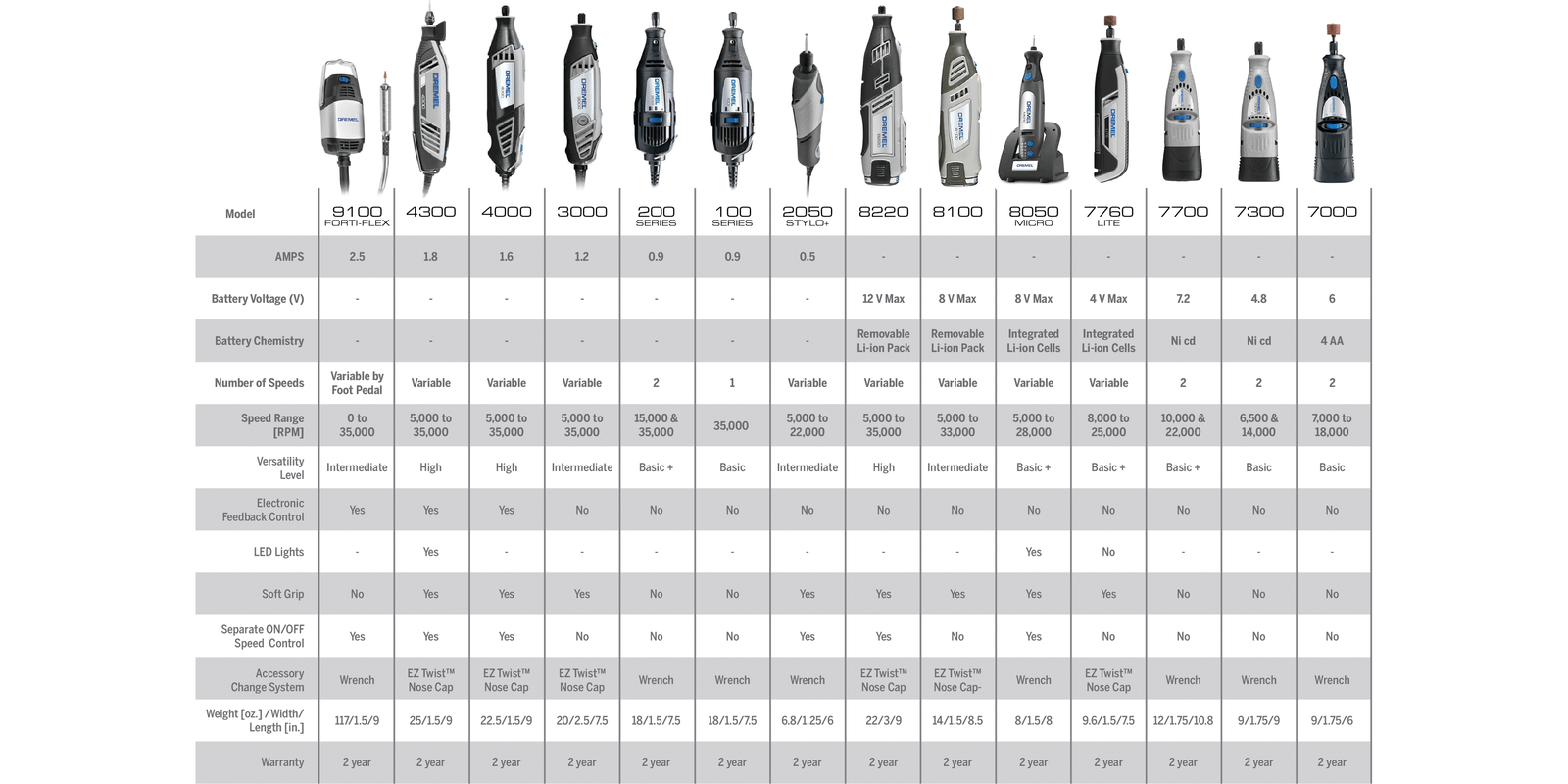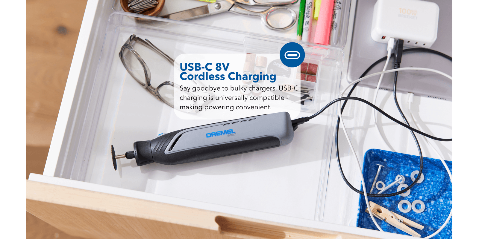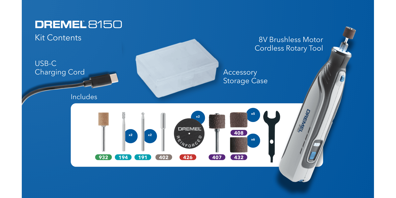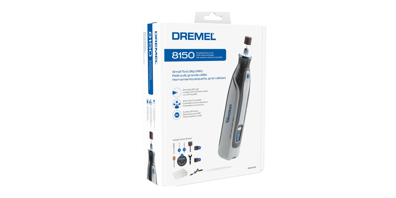 Pencil-like grip for comfort, control, and precision on detailed projectsSmall enough to store in a toolbox, garage, or drawerEngraves, cuts, polishes, sands, sharpens and moreConvenient USB-C chargingBright LED light illuminates the work areaVariable speed range of 5,000-30,000 rpm to tackle a variety of tasksFully compatible with all Dremel rotary tool accessories and attachments