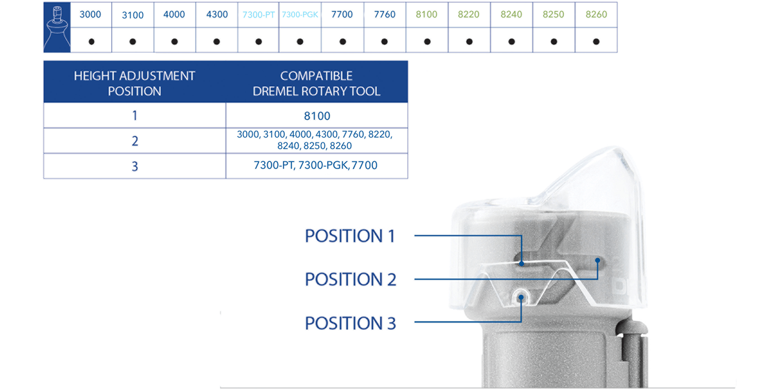 Guide and attachment ensures the correct angle for trimming your pet's nailsDesigned to effortlessly collect nail dust and protect fur around pawsEasy-to-use from the comfort of home for all breeds and sizes of dogsClear cap for easy viewing of the nail throughout the projectSimple hinge allows for easy assembly, removal and cleaningWorks seamlessly with a variety of Dremel rotary tools, including: 3000, 3100, 4000, 4300, 7300-PT, 7300-PGK, 7700, 7760, 8100, 8220, 8240, 8250, 8260Not compatible with the Dremel 7350-PETD