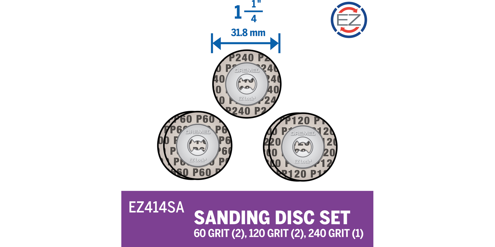 The EZ414SA is designed with the patented EZ Lock™ system making accessory changes 6X faster than standard Dremel sanding discsAllows for flat sanding and edge sandingLasts twice as long and removes twice as much material than standard Dremel sanding discsAll three grits in one kit allow the completion of multiple sanding phases on a projectCompatible with all Dremel rotary tools