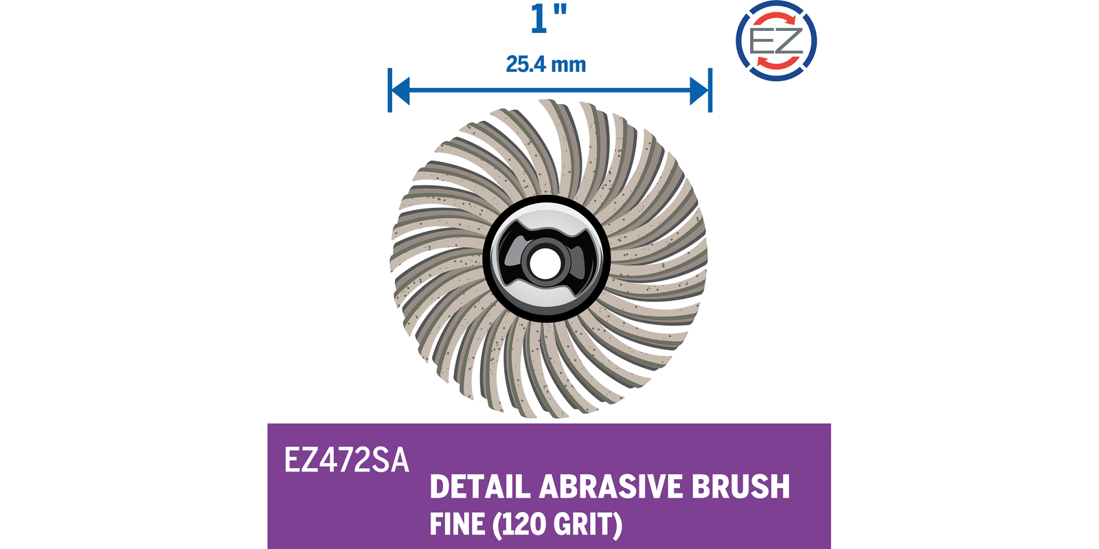 The EZ472SA is designed with the patented EZ Lock™ system making accessory changes 6X faster than using a standard mandrelAllows sanding of contours, details, and hard-to-reach areasBuilt-in polishing compound – rubber bristles have abrasive inside, no need for polishing compoundRemoves exterior surface layer without damage to base layer below and removes the paint but not the wood with light pressureSand delicate surfacesGet into tight contours for easy restorationClean wood, aluminum, plastic, metal, steel and vinyl