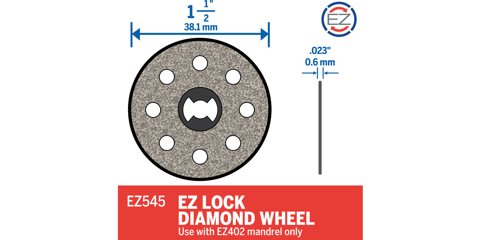The EZ545 is designed with the patented EZ Lock™ system making accessory changes 6X faster than using a standard mandrelDiamond coated wheel for increased durability and low wearCuts 1/2-Inch thick floor tile and ceramic materialsAllows precise straight cuts with little dust