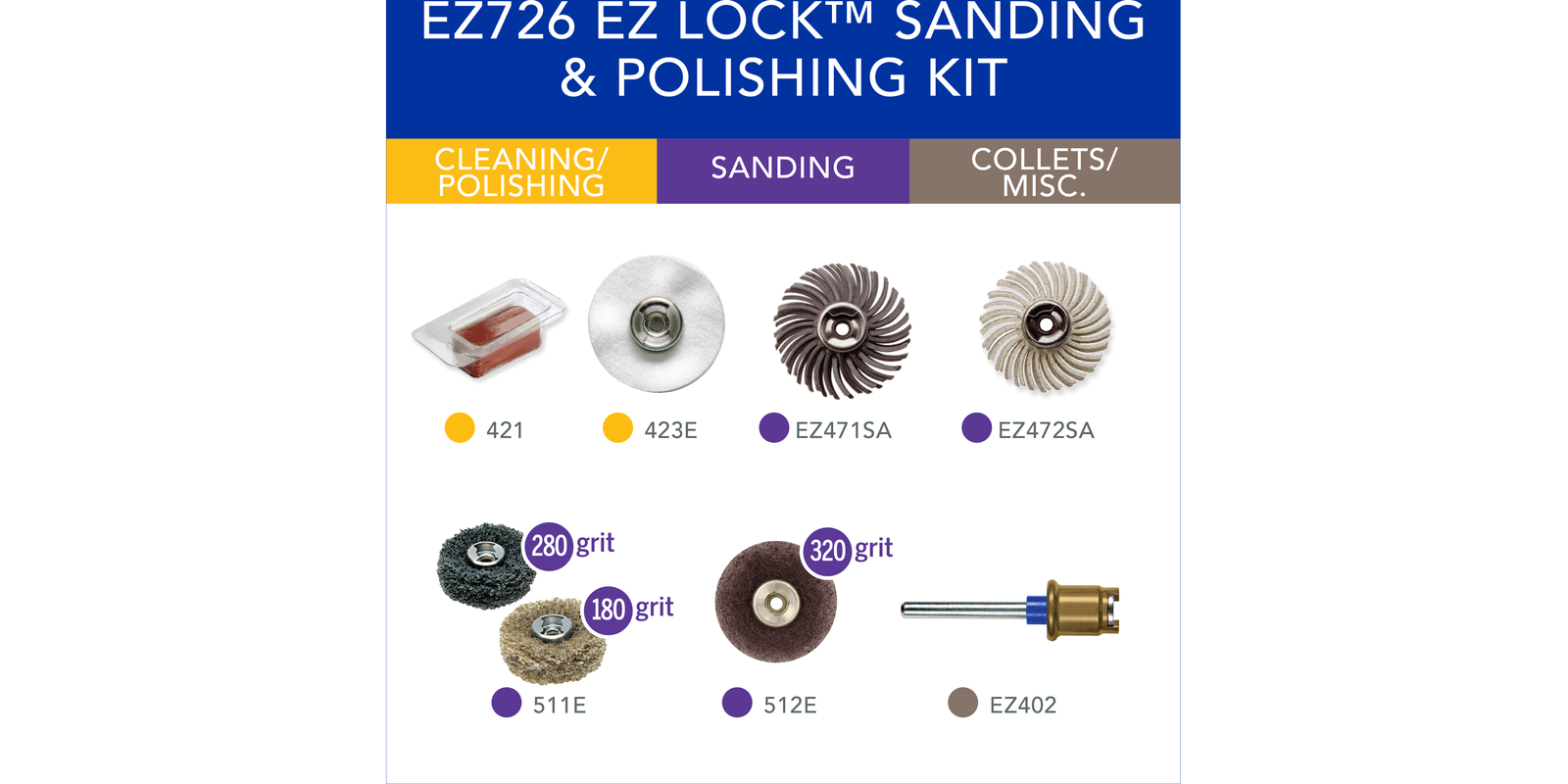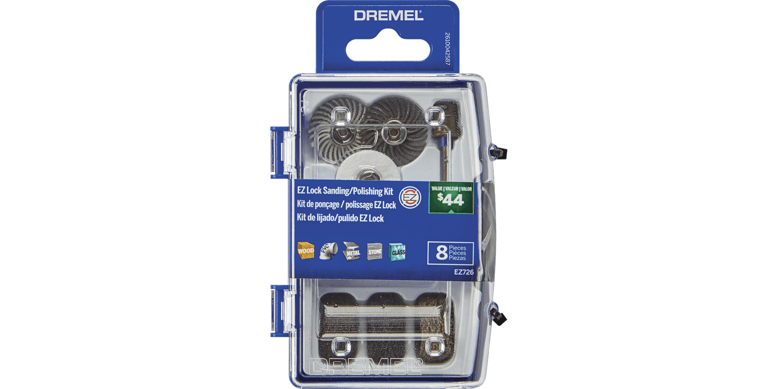 Specially curated kit of 8 EZ lock™ accessories for your sanding & polishing needsReusable storage case keeps your accessories organizedAccessory set includes a variety of EZ Lock rotary accessories. The patented Dremel EZ Lock™ system makes accessory changes 6X faster than using a standard mandrelClear lid, storage bin, and removable tray make accessories easy to locateCan stack easily, stand upright, or hang on a wall by hookSmall footprint saves space