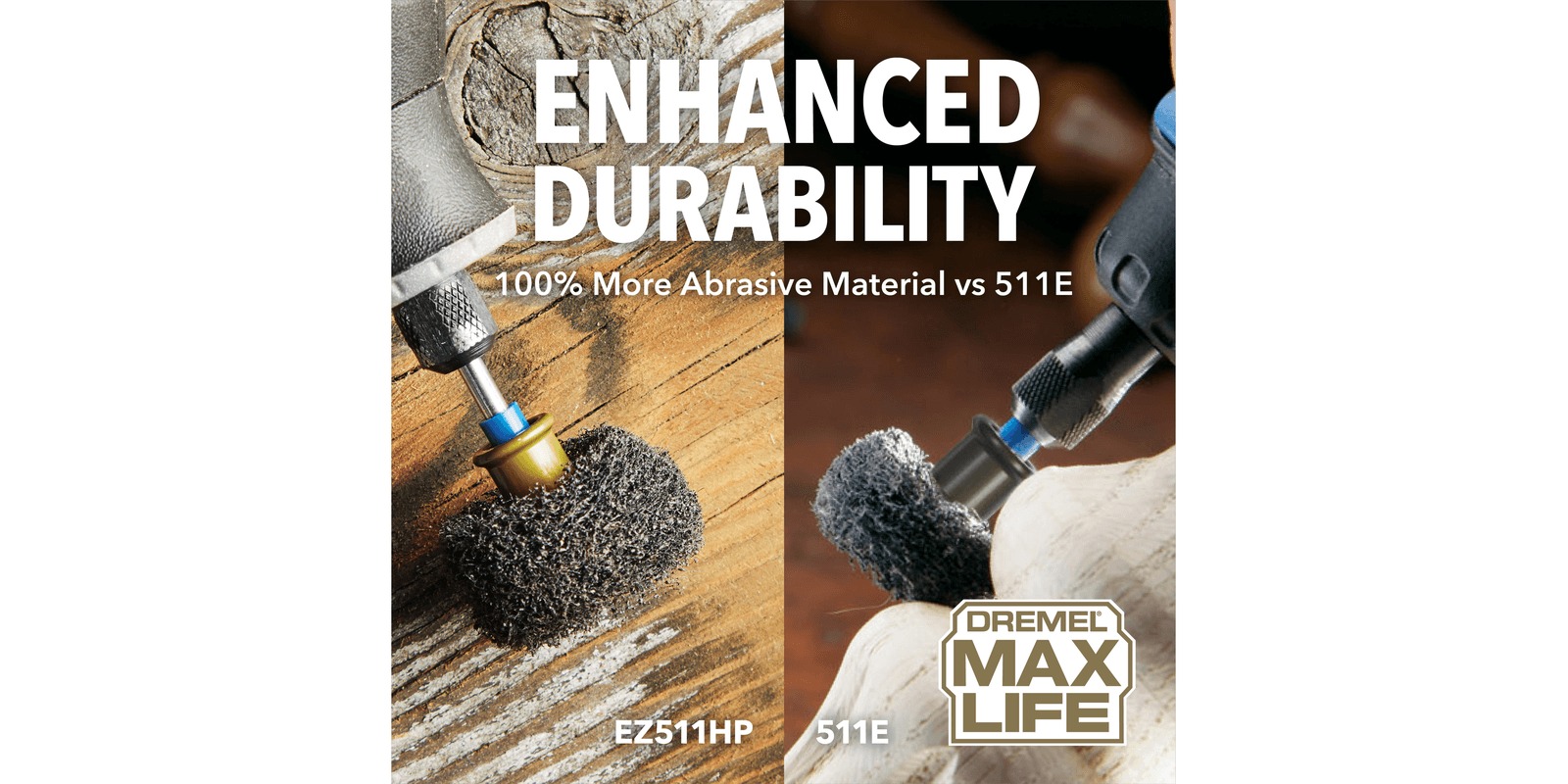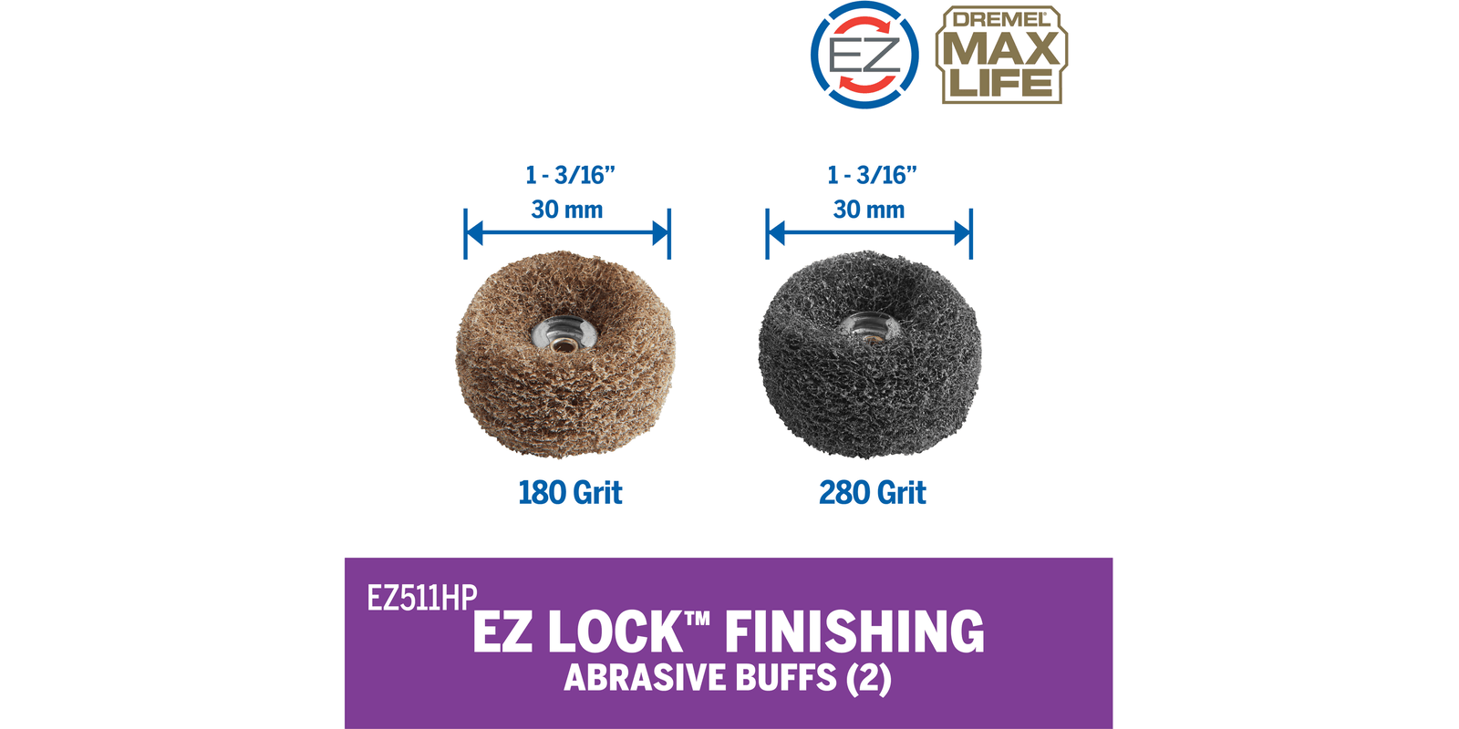 At least 4X longer life compared to the Dremel 511ELonger life achieved by adding 100% more of the same, durable abrasive material used on the 511E abrasive buffsIncludes two 1-3/16" (30mm) diameter sanding buffs; 180 & 280 grit finishing abrasive buffsGreat for detail cleaning and light sanding, as well as paint removal on delicate materialsIdeal for use on wood, plastic, glass, and metals such as steel and aluminumDesigned with the patented EZ lock™ system making accessory changes 6X faster than using a standard mandrelCompatible with both EZ402 EZ lock™ mandrel and standard 402 mandrel