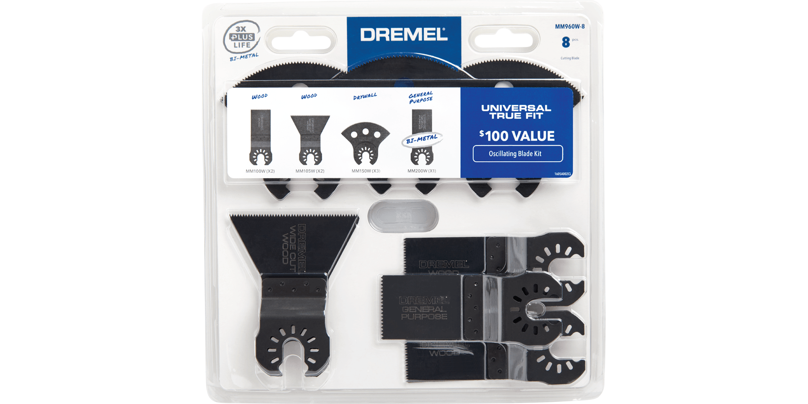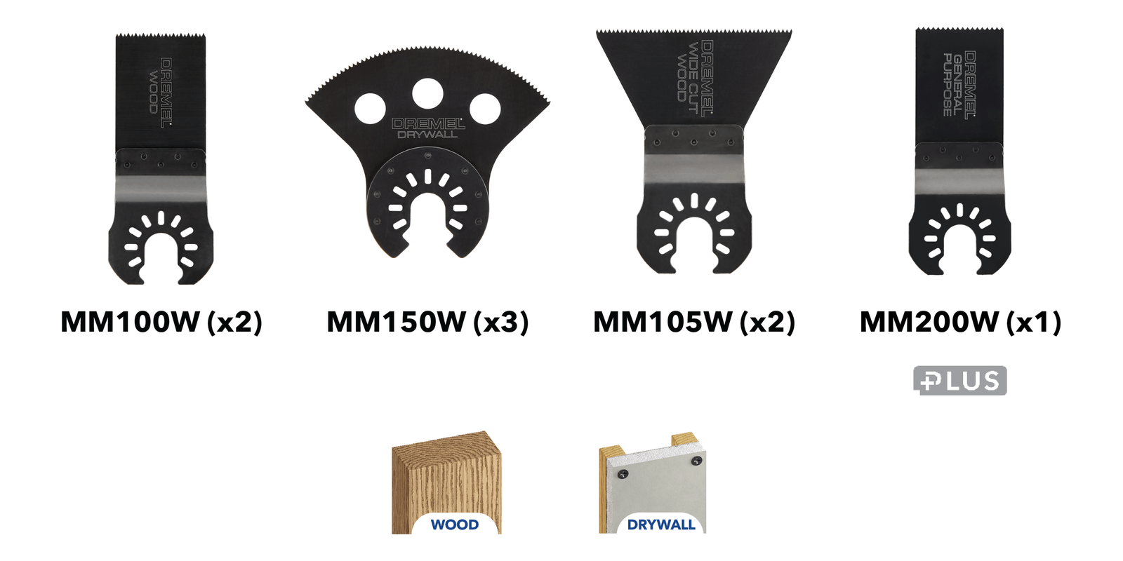 Universal true fit blades easily fit open-back oscillating tool brands including Dremel®, Dewalt®, Craftsman®, Milwaukee®, Rockwell®, Worx®, Porter Cable®, Ridgid®, Ryobi®, Skil®, & Kobalt®Universal true fit blades are not compatible with Starlock® toolsIncludes 2 mm100w wood blades 2 mm105w wood blades 3 mm150w drywall blade and 1 general purpose bladeMM200W plus+ bi-metal blade ideal for wood, drywall, plastic, PVC, vinyl and laminateDremel plus+ bi-metal blades provide up to 3x life in metal vs standard bi-metal oscillating bladesEngineered to deliver quality, trusted performance again and again with either corded or cordless oscillating multi-tools