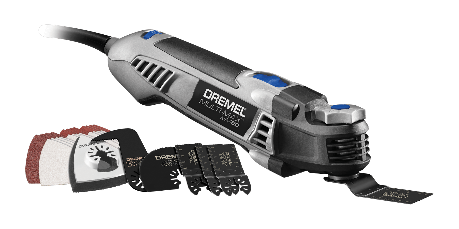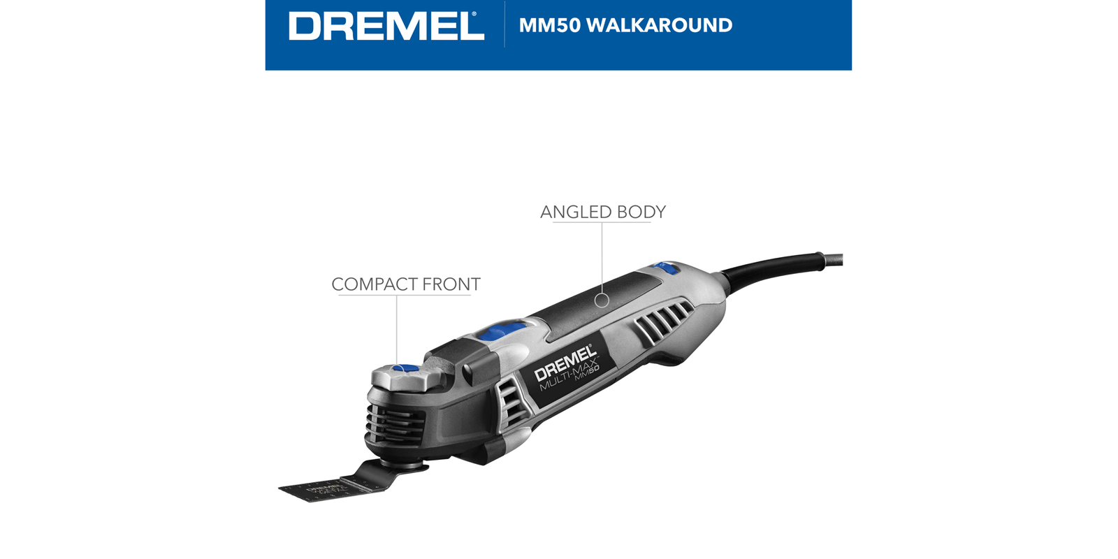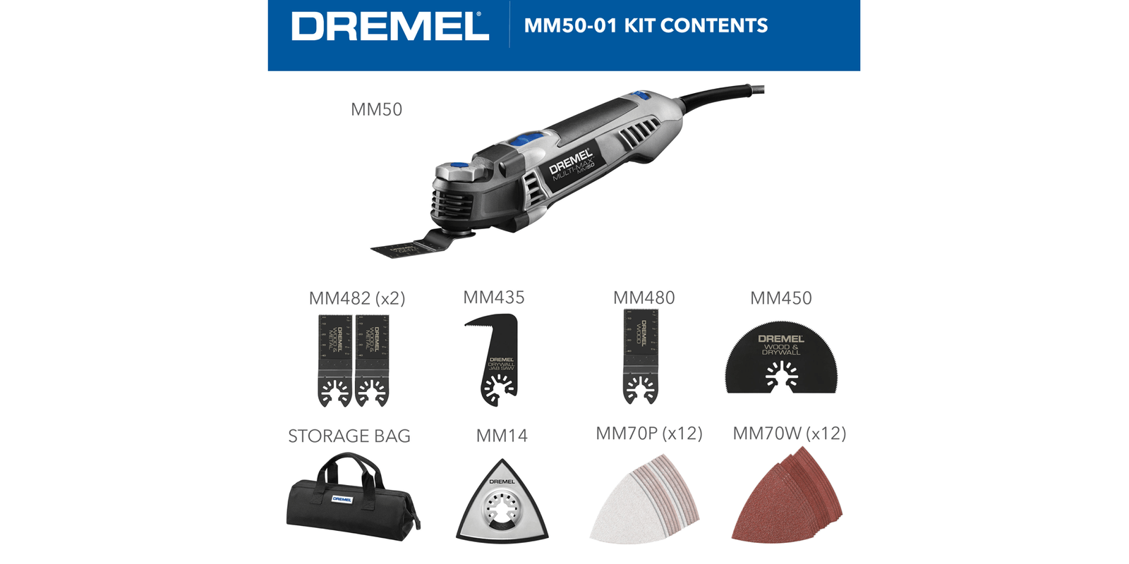 The Dremel MM50 has a robust design for low vibration operation giving you better control for precise and clean cutsThe front end is 30% more compact which allows you to get into tight hard-to-reach spaces where other won’t fitExclusive angled body design improves control when flush cutting and the powerful 5 amp motor gets the toughest jobs donePowerful 5.0 amp motor, highest in its class, delivers pro performance to get the toughest jobs done, such as cutting door jambs, trim, baseboards or any other related projectTool-less easy blade change system allows you to change accessories by simply twisting the knob, pushing it down and inserting accessoryVariable speed – from 10,000-21,000 OPM for optimal performance and control when working with various materialsThe kit includes one storage bag and a variety range of 30 accessories for cutting and sanding wood, drywall, metal and more