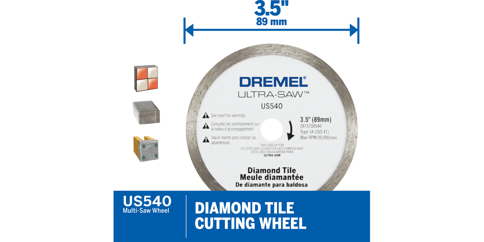 Diamond coated wheel for tile and masonry cutting applicationsCuts most tiles and masonry materials with ease and precision3.5 In. diamond coated wheel cuts a variety of tile including wall tile, floor tile, porcelain, slate, stone, and cement backer boardMay also be used to remove groutCompatible with all Dremel corded and cordless Ultra-Saws