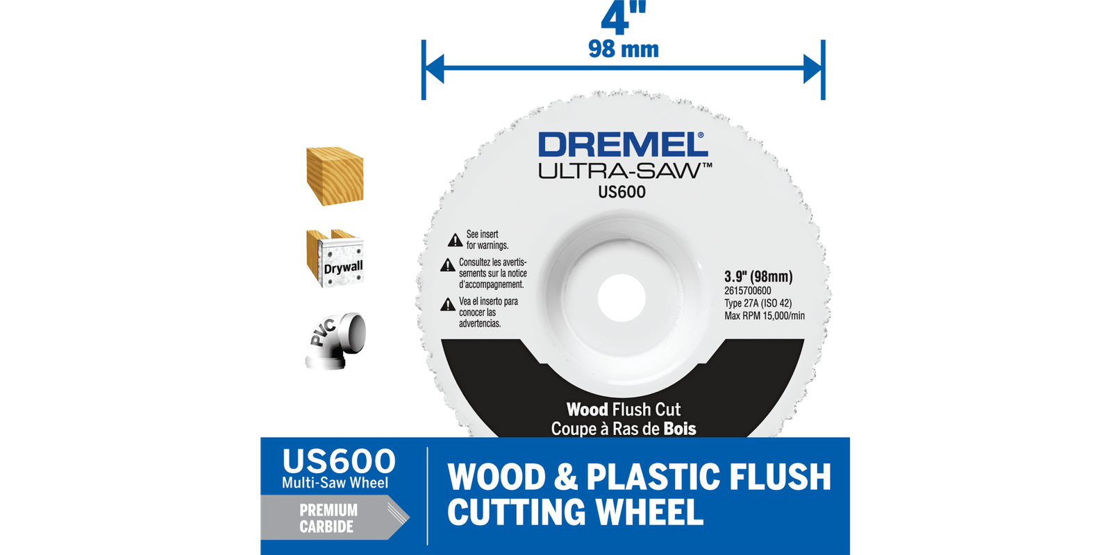 Cuts a variety of wood materials including soft and hard wood, plywood, composites and more.Dome-shaped wheel perfect for 3/4-Inch flush cuts.Compatible with all Dremel corded and cordless Ultra-Saws.Premium Carbide high-quality engineered flush cutting wheel for cutting a variety of wood materials including soft and hard wood, plywood, composites, laminate flooring, drywall, PVC and plastic.